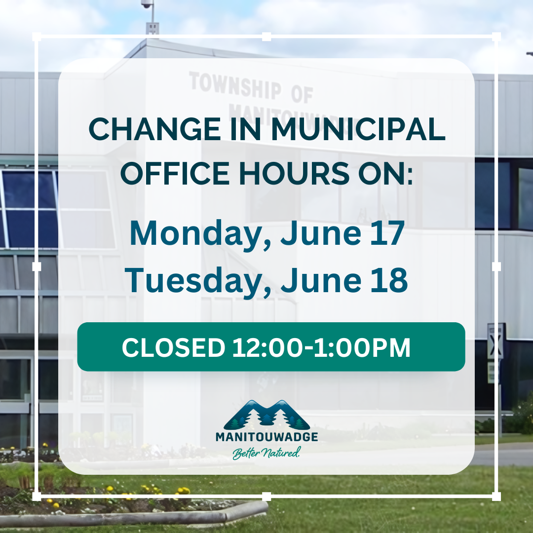 June 13, 2024 - In News By Chelsea 0 Notice: Municipal Office closed 12-1pm June 17 and June 18 Please be advised that the Municipal Office will be closed from 12-1pm on Monday, June 17 and Tuesday, June 18. We apologize for any inconvenience this may cause and thank you for your understanding. Previous Update – Special Council Meeting June 11 2024 Next Notice: June 18 Regular Council Meeting cancelled