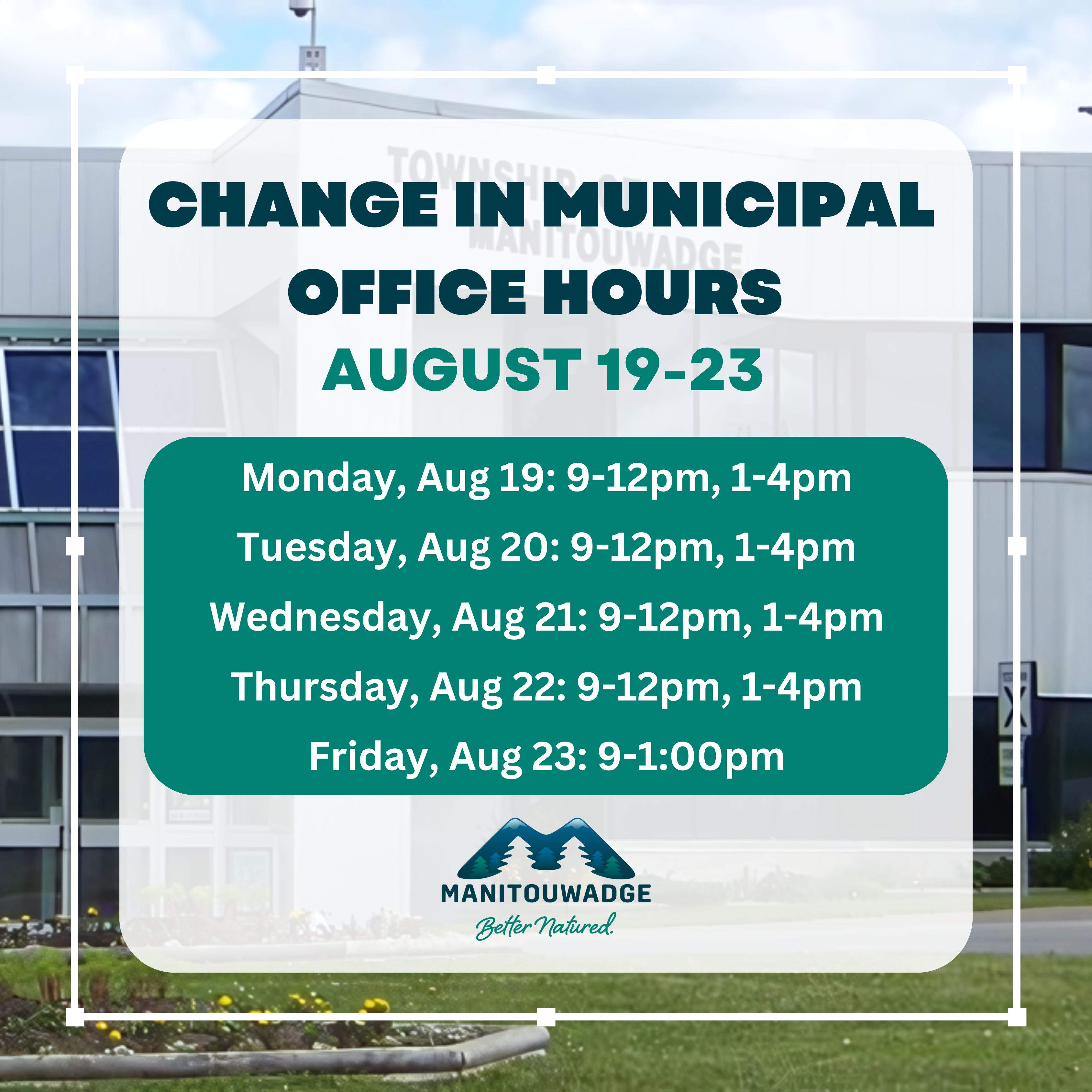 August 16, 2024 - In News By Chelsea 0 Change in Municipal Office hours Aug 19-23 Please note the change in Municipal Office hours for the week of August 19-23. Monday – Thursday: Closed 12-1pm for lunch Friday: Closed at 1pm Previous Special Council meeting and Regular Council meeting August 15, 2024 Next Household Hazardous Waste Collection Sept. 21