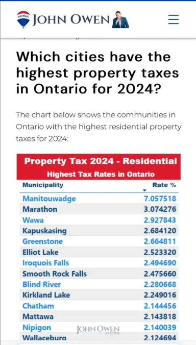 In response to an article circulating on Facebook posted by John Owen (ReMax) highlighting high tax rates in Ontario and comparing the Manitouwadge tax rate to other local communities: