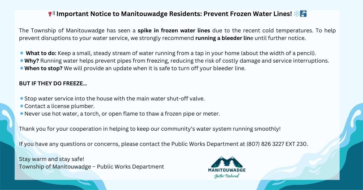 The Township of Manitouwadge has seen a spike in frozen water lines due to the recent cold temperatures. To help prevent disruptions to your water service, we strongly recommend running a bleeder line until further notice.