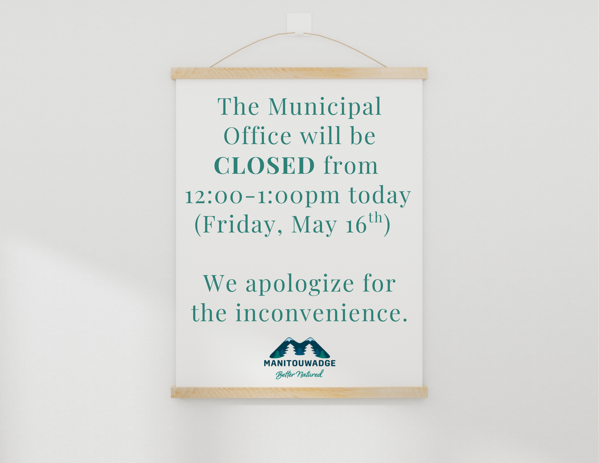 May 16, 2025 - In News By Chelsea 0 Municipal Office Closure – 12:00 pm – 1:00 pm on May 16th, 2025 Please be advised that the Municipal Office will be closed from 12:00 pm – 1:00 pm today (Friday May 16th, 2025). We apologize for the inconvenience. Previous Municipal Office Closure – Victoria Day Next Public Notice: Regular Council Meeting May 21st Cancelled