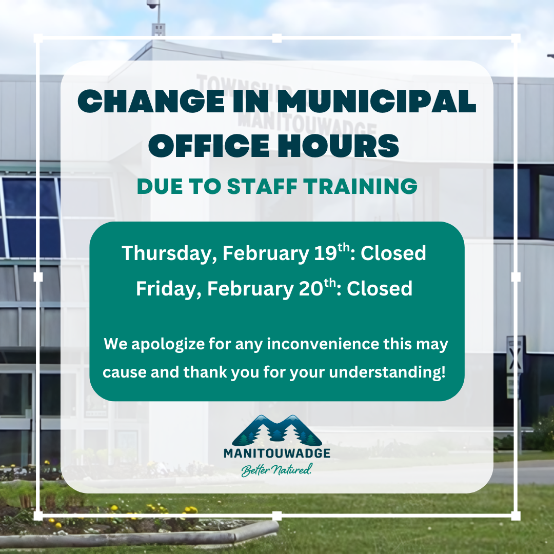 Please note that the Municipal Office will be closed on Thursday, February 19 and Friday, February 20 for staff training.